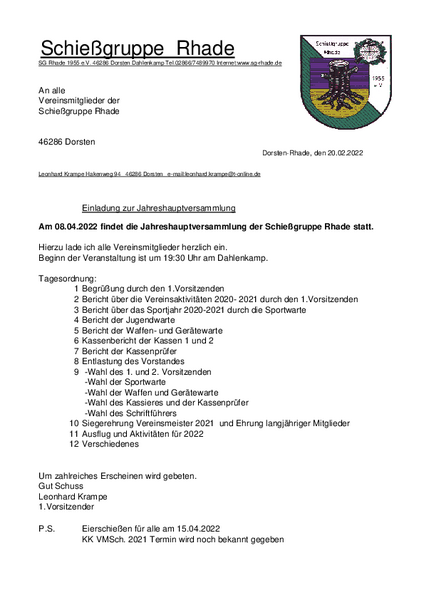 Der 1. Vorsitzende Leonhard Krampe lädt alle Vereinsmitglieder zur diesjährigen Jahreshauptversammlung am 8.4.2022 um 19:30 Uhr ein.